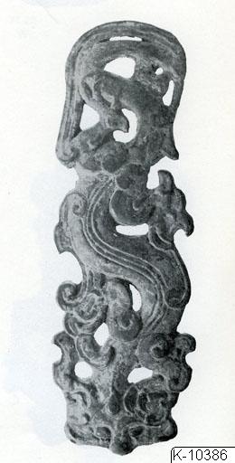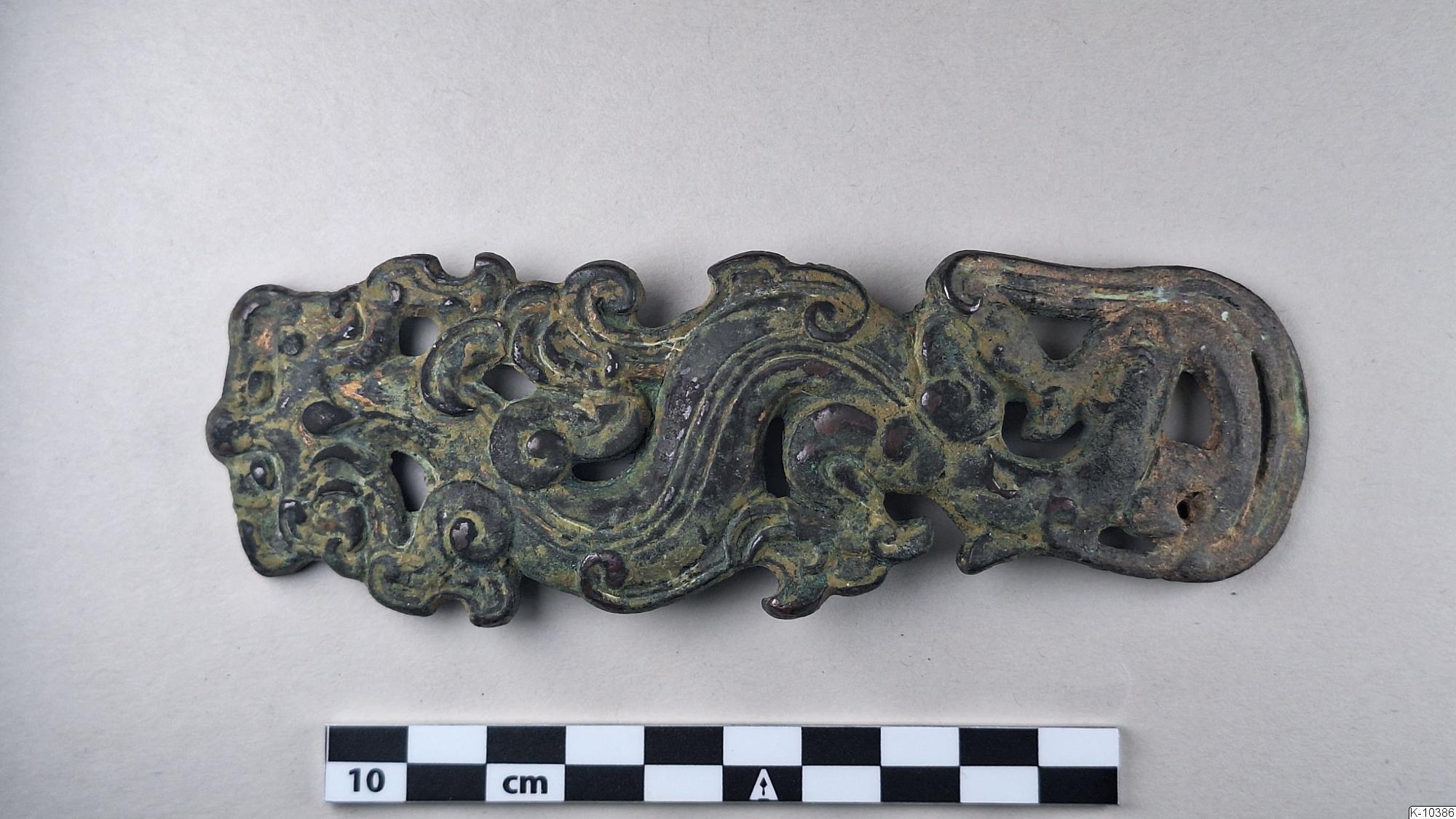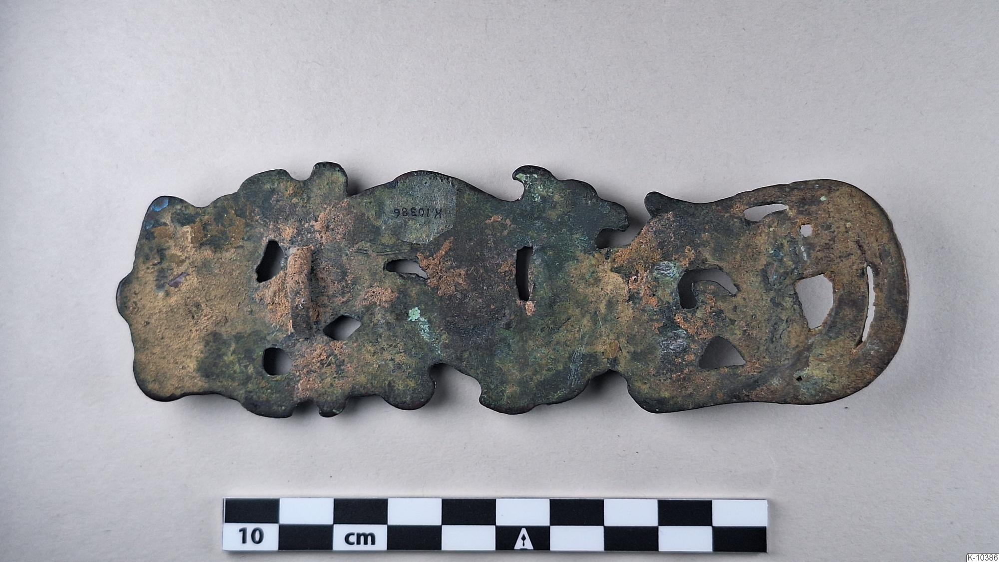 • Större avlångt beslag, genombruten dekor i form av en drake. En tvärsittande märla på baksidan, den andra bortfallen. Förgylld.