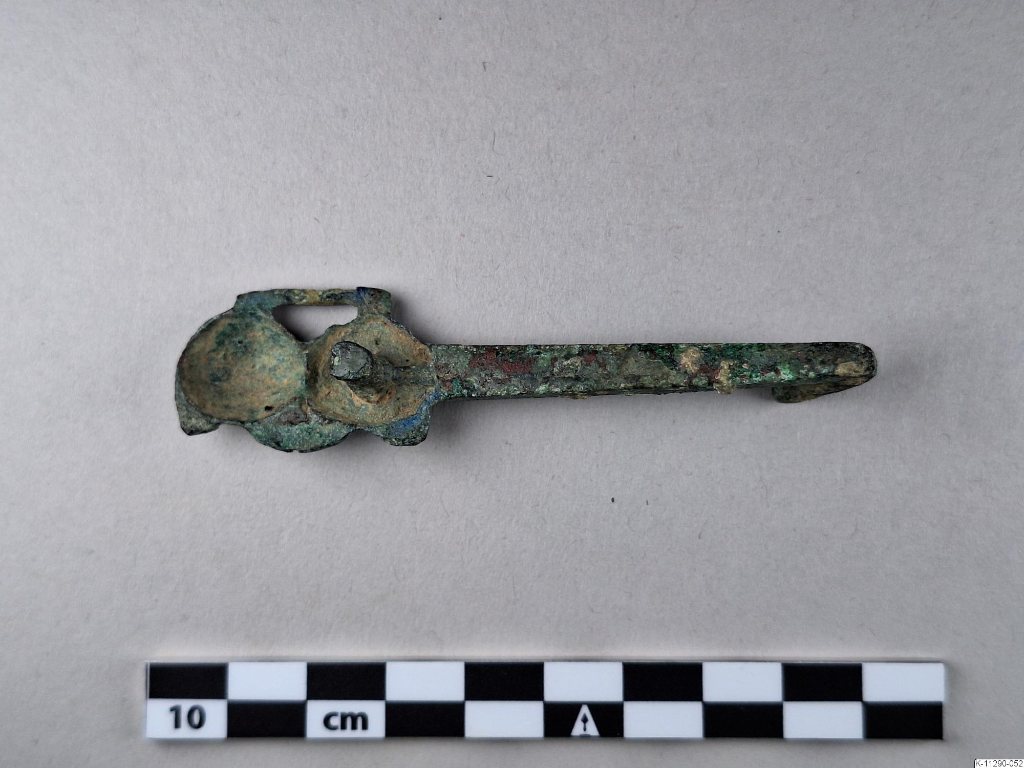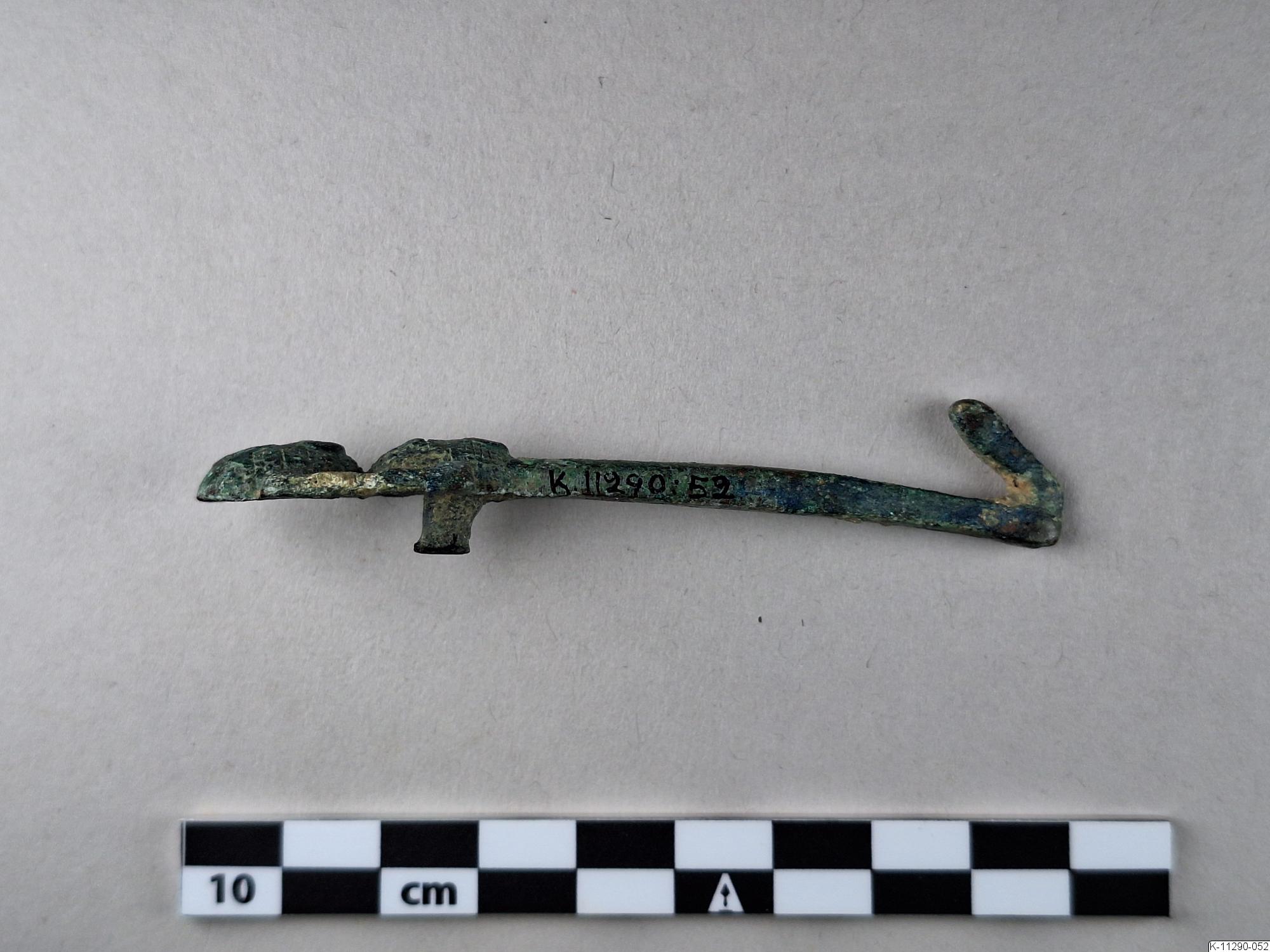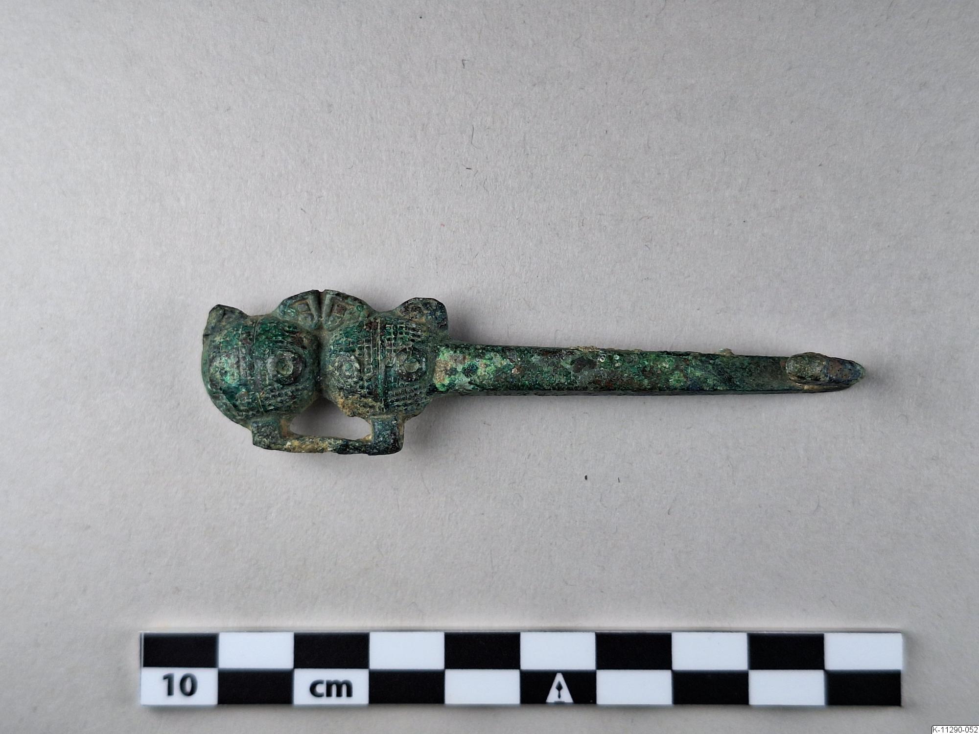 • Bälthake av Ordostyp. Kroppen består av två djurhuvuden sida vid sida samt med munnarna förenade genom en pinne. Grön patina.