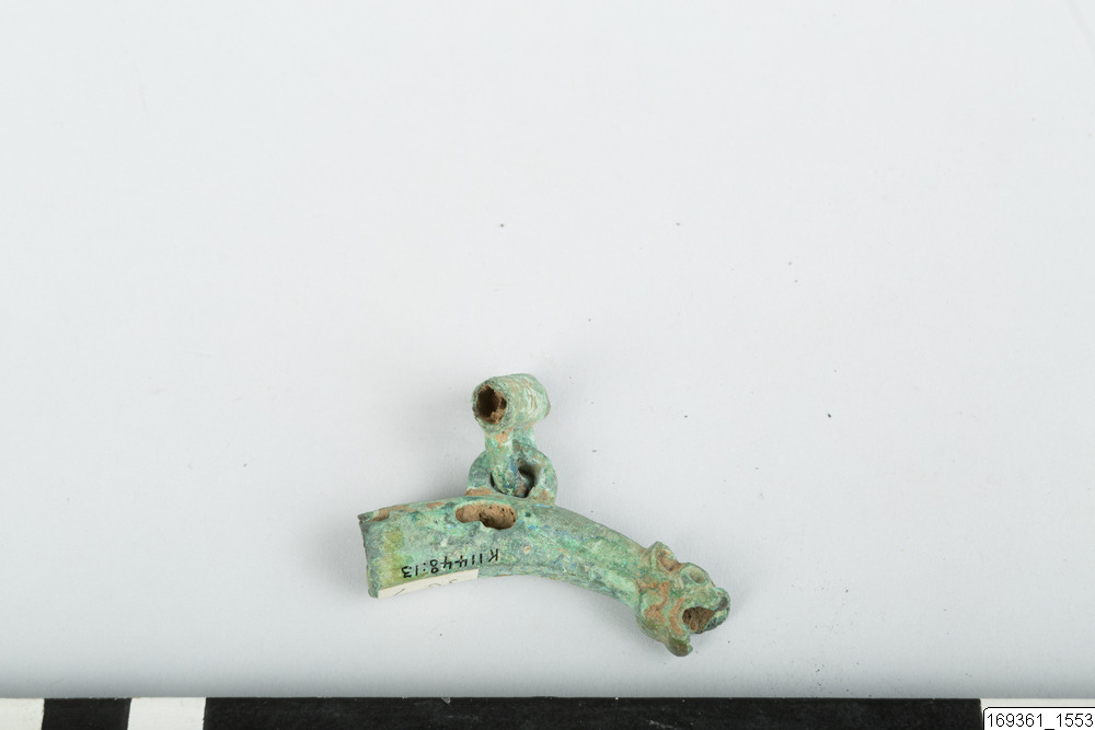 • Litet beslag med djurhuvud, rörformigt. På sidan är ett ringformat handtag eller dylikt fästat.
