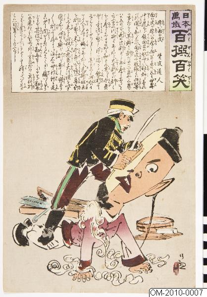 • Träsnitt av Kobayashi Kiyochika från serien ”Leve Japan, hundra samlade skratt” (alternativ läsning ”Leve Japan, hundra strider, hundra segrar”) på japanska Banzai hyakyusen hyakusho.