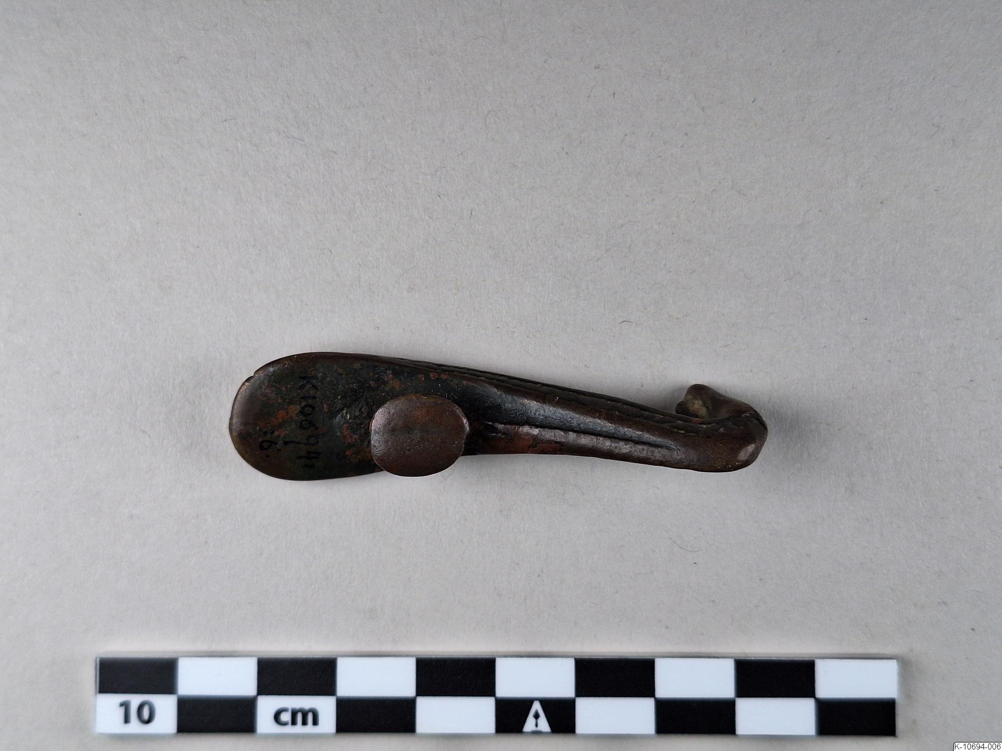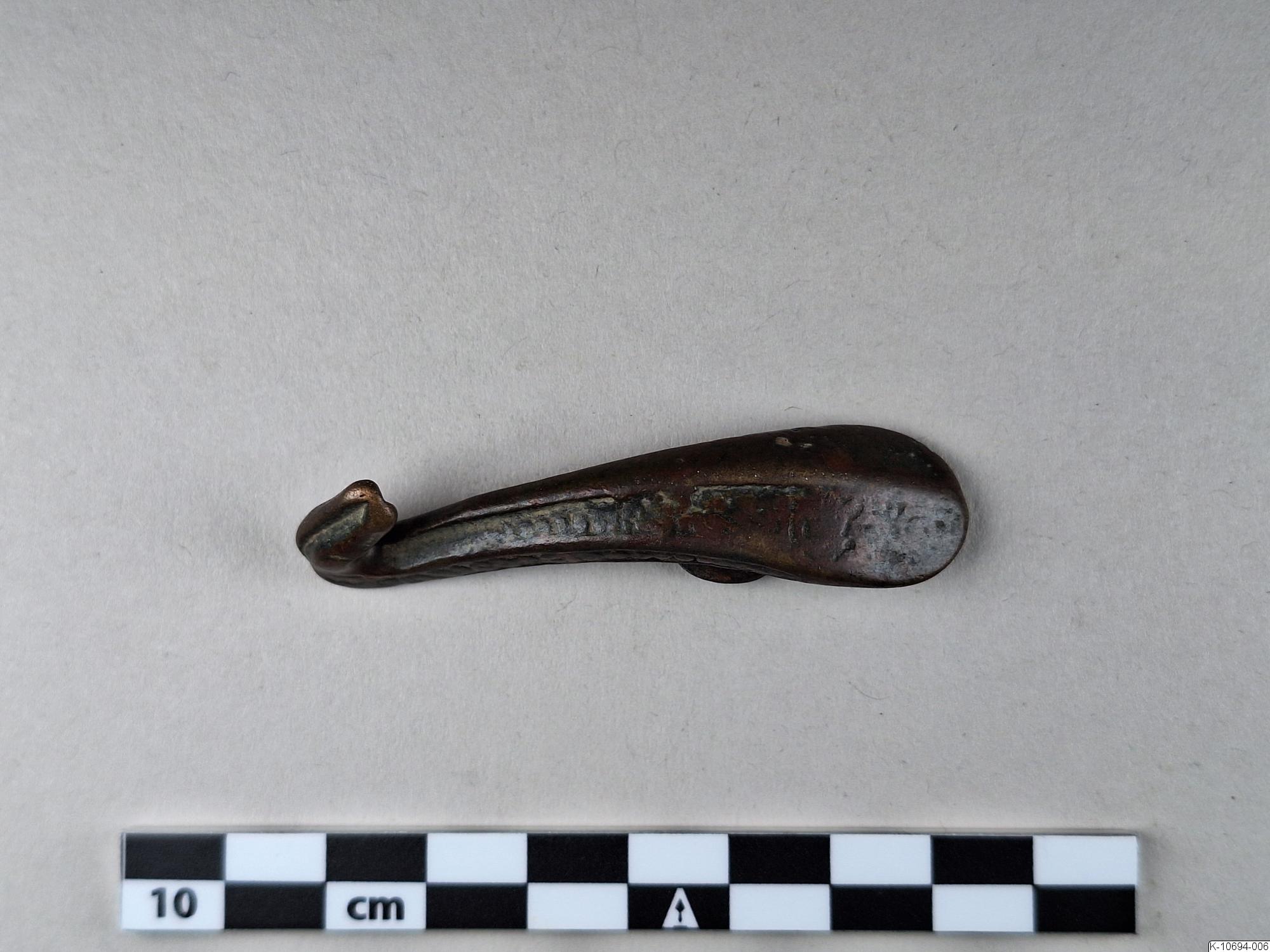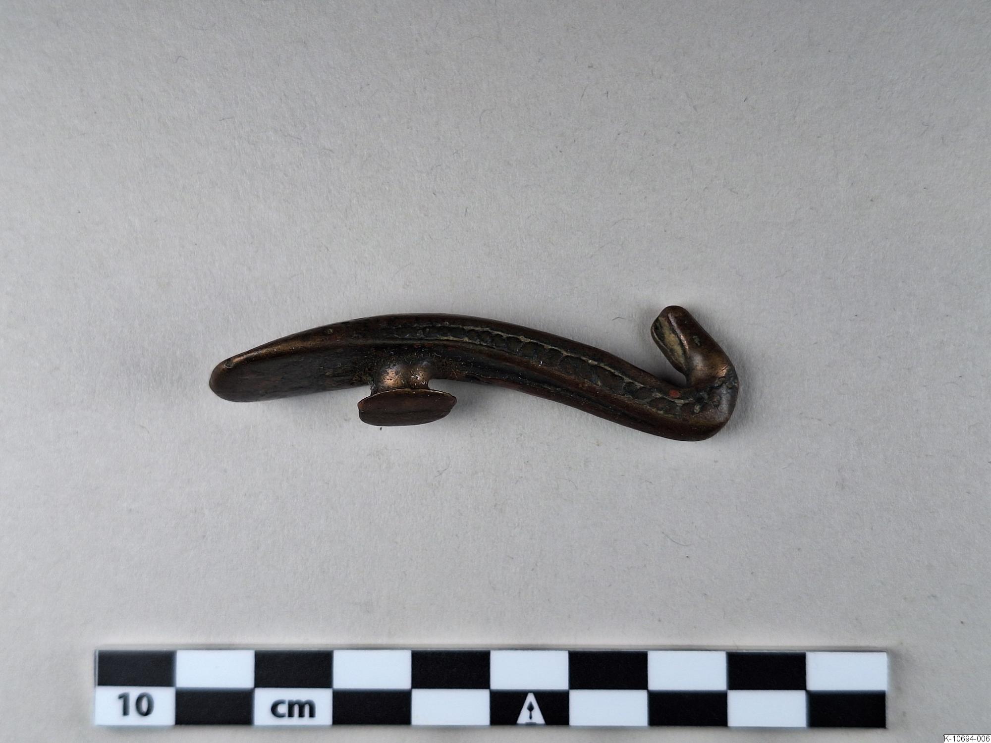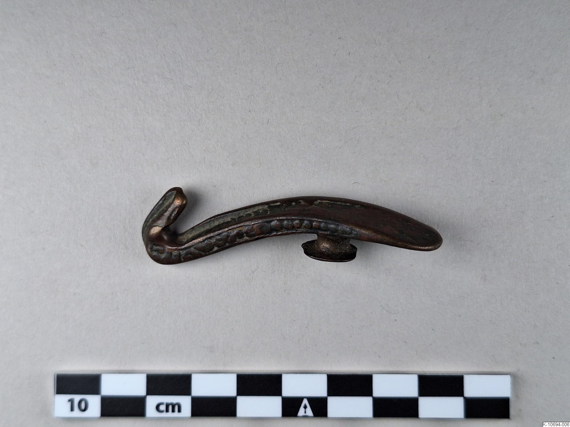 • Sned dräkthake med mönster på kanterna. Den uppåt avsmalnande plattan inlagd eller pålagd med rött ämne.