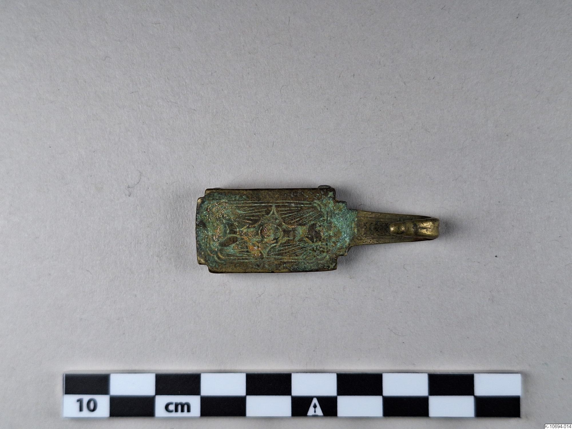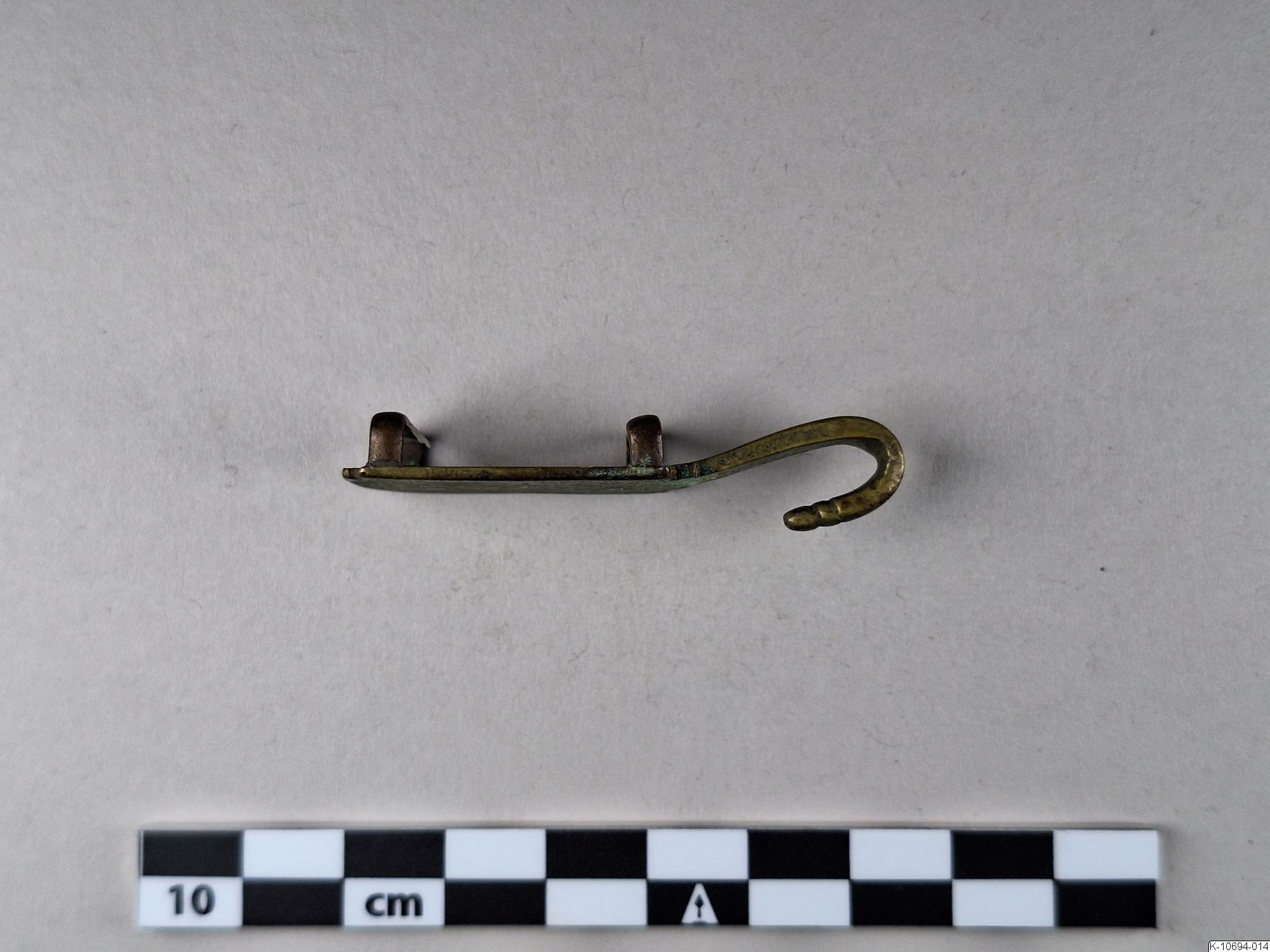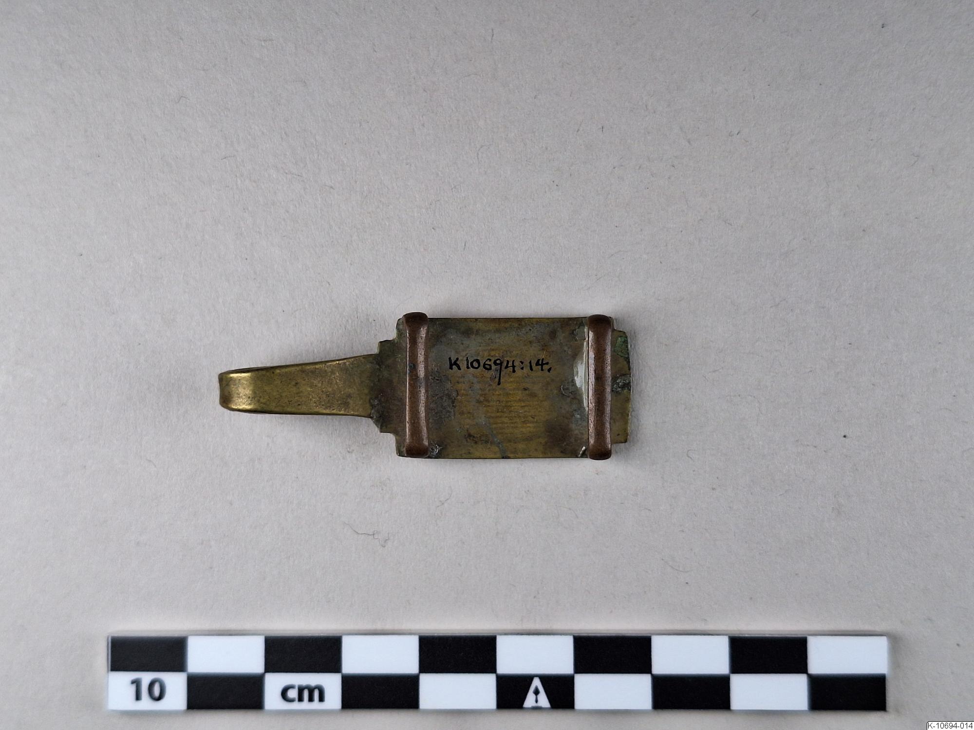 • Hake med inristad platta (av mässing?) med två remmärlor på baksidan.