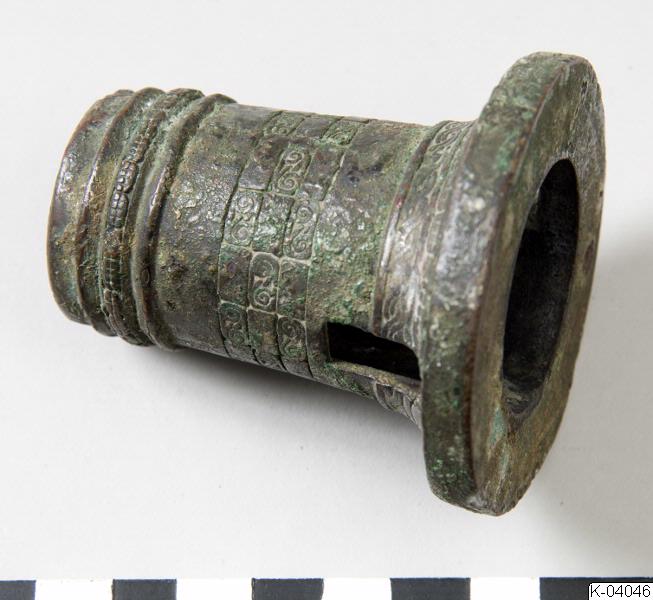 Hjulaxelbeslag utan nit. Niten saknas. Dekorerat på mitten med ett brett band av små rektanglar, av vilka varannan är sirad med två spiraler. Närmare ytterkanten en upphöjd ring av små figurer, på båda sidor därom en slät upphöjd ring.