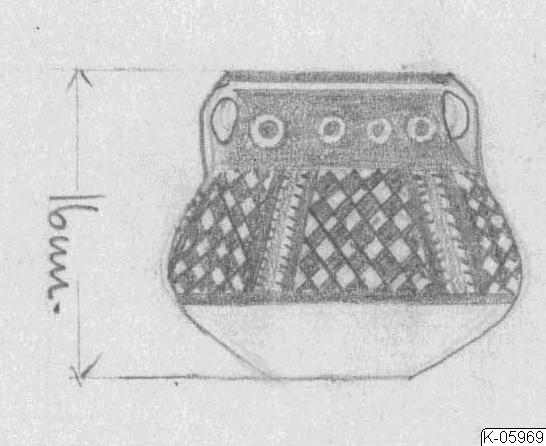 • Medelstor gravurna av Yang Shao-perioden med vid, låg mynning. Målning i vertikala fält med schackmönster och mellan fälten staplar av dödsmönster.