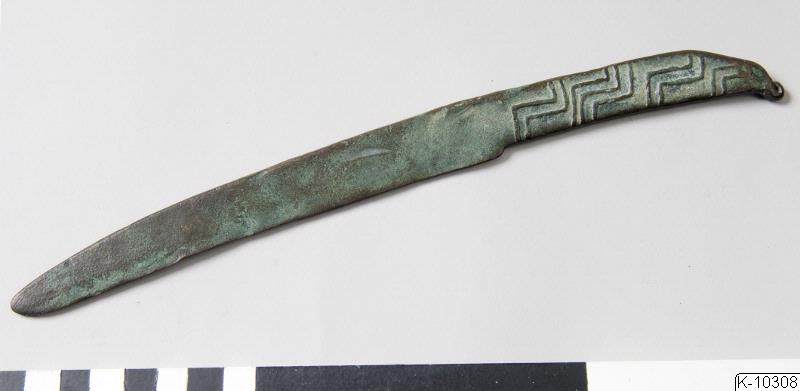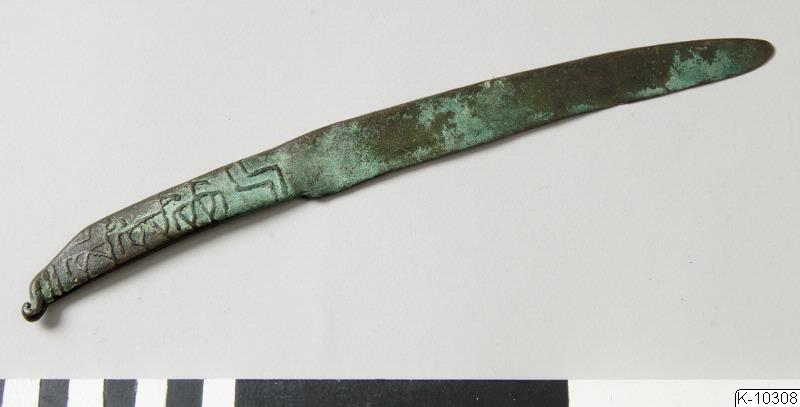 Kniv, engeggad. Djurstilen. Kniven är böjd, på ena sidan av handtaget dekorerad med tre djur, på den andra sidan ornament. Skaftet avslutas med en tillböjd hake.