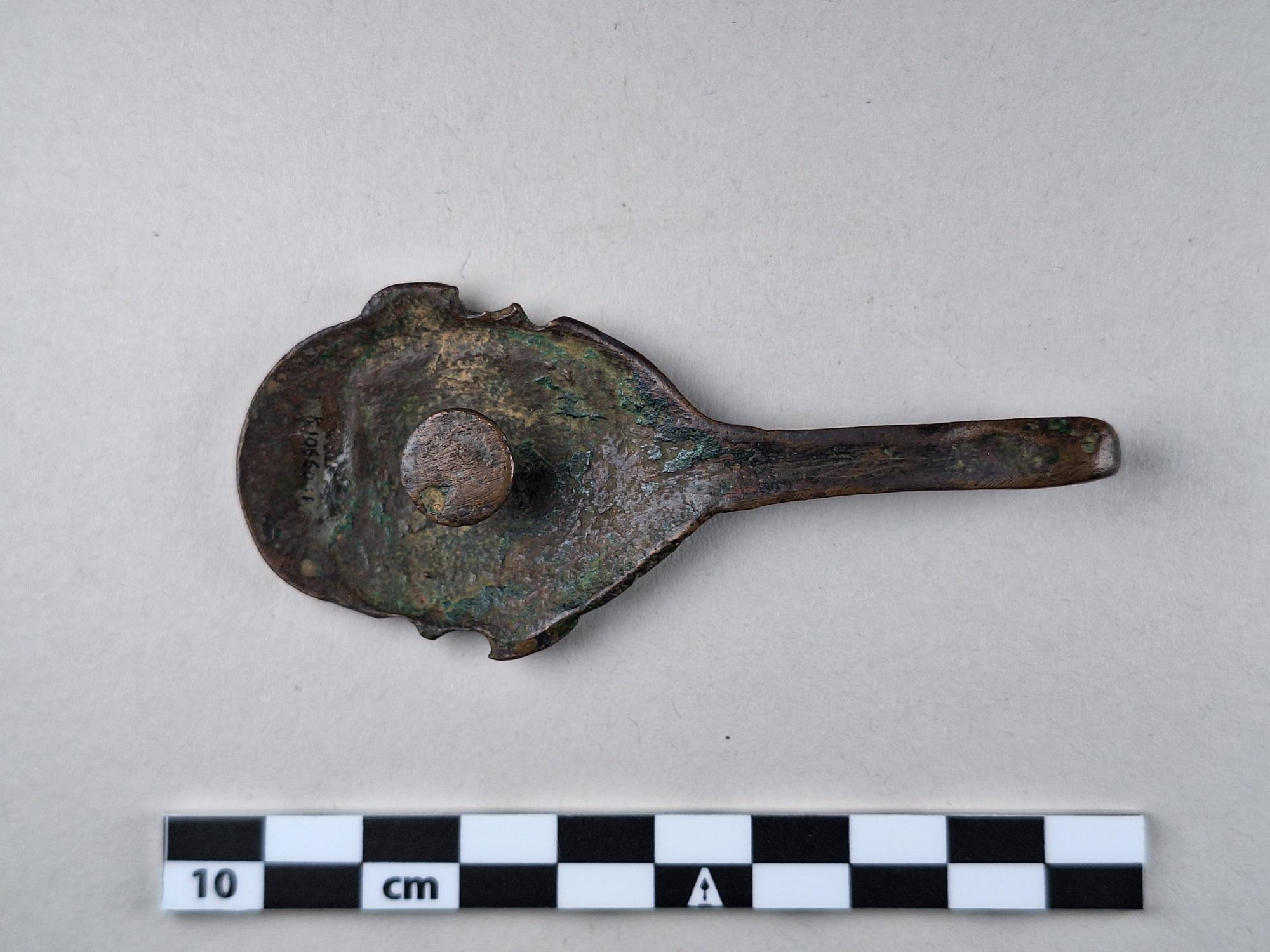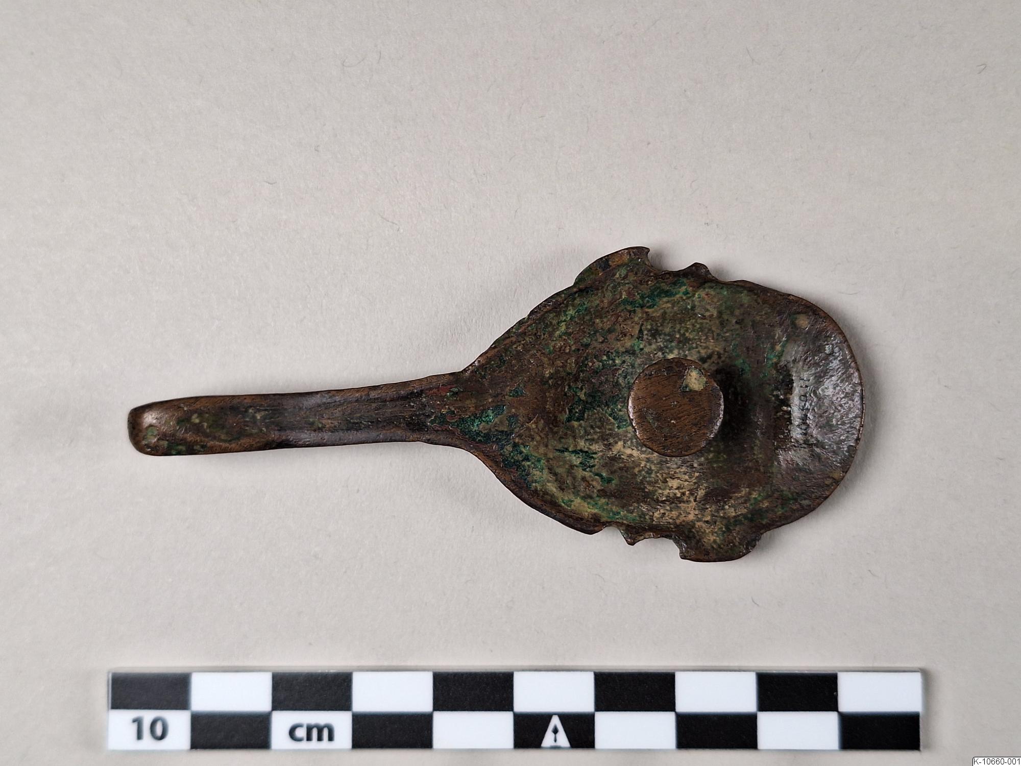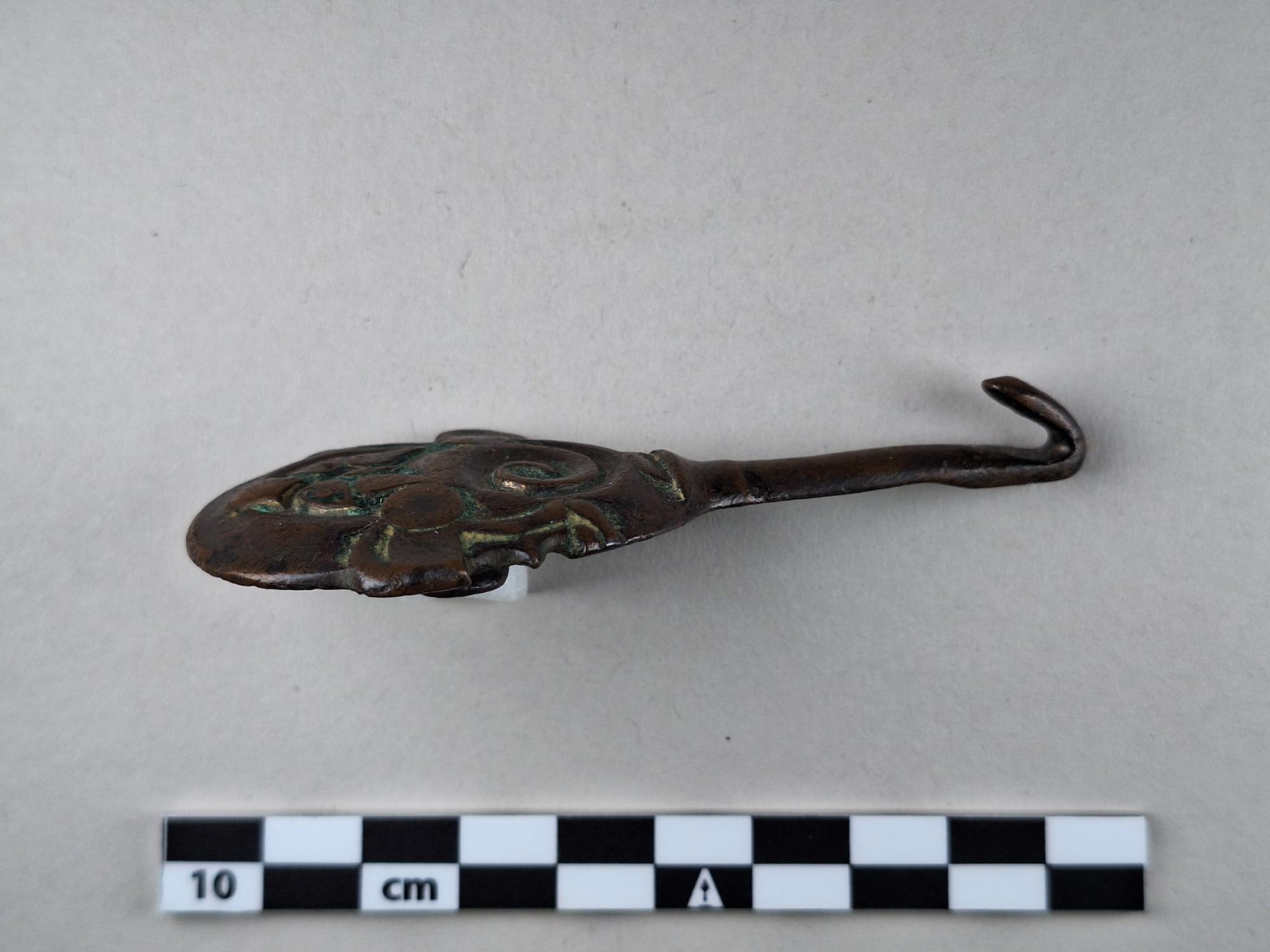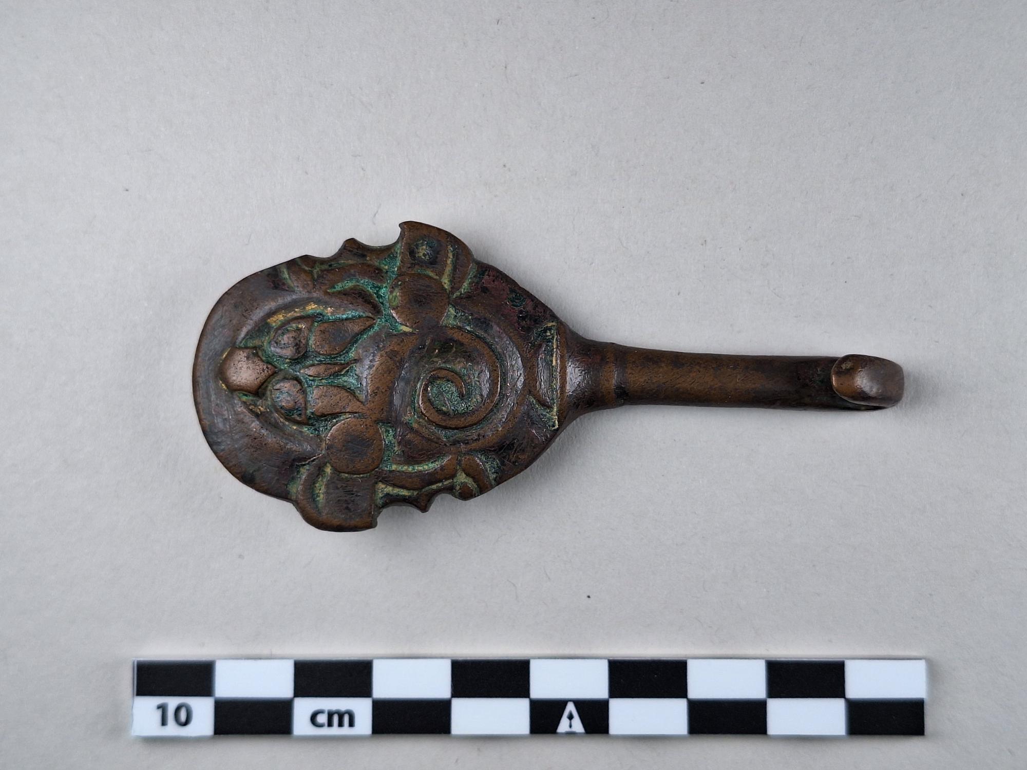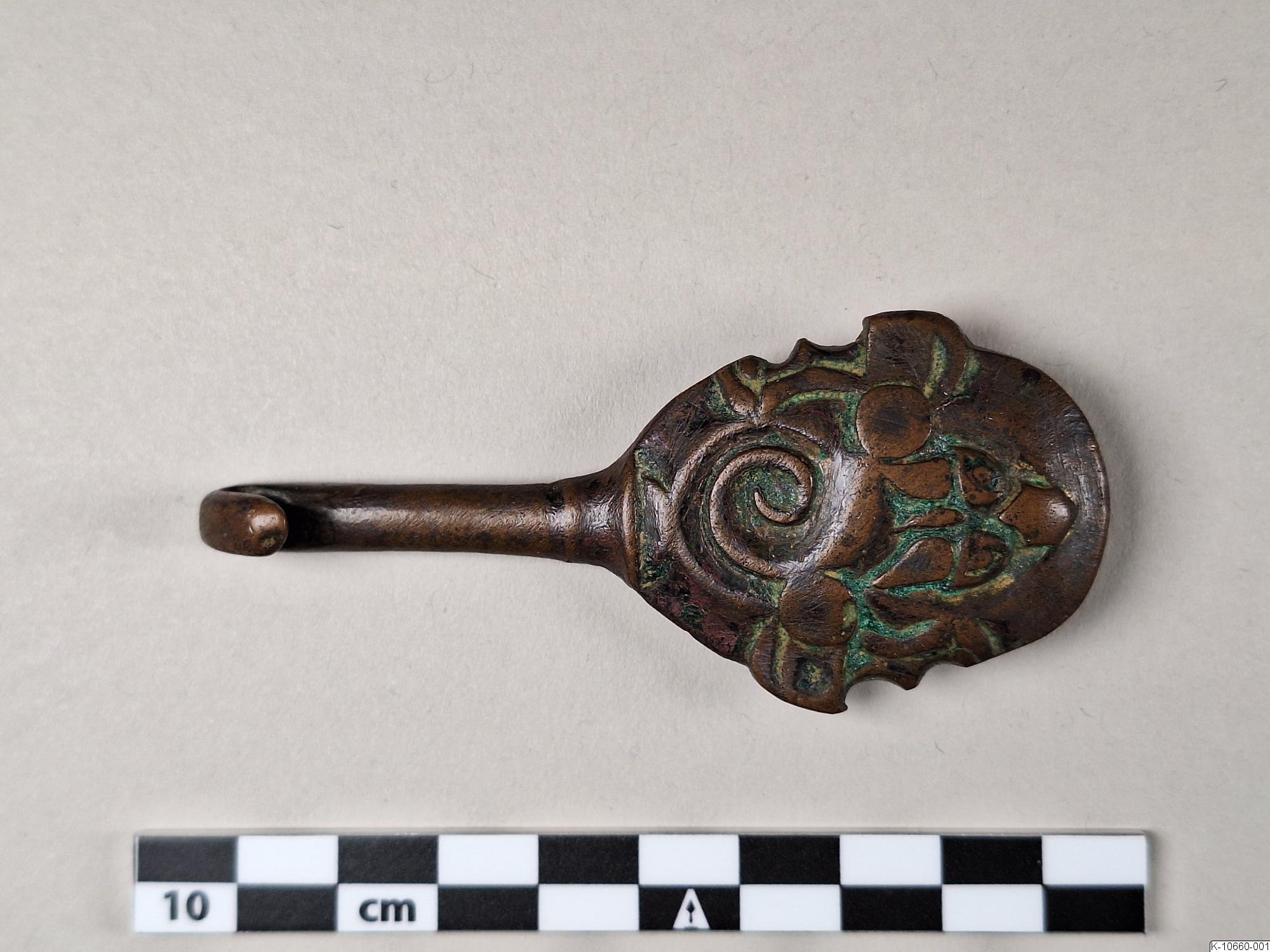 • Dräkthake, oval med djurhuvud och en spiral. Halsen lång och smal. Spår av förgyllning.