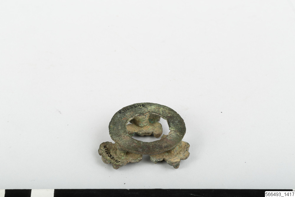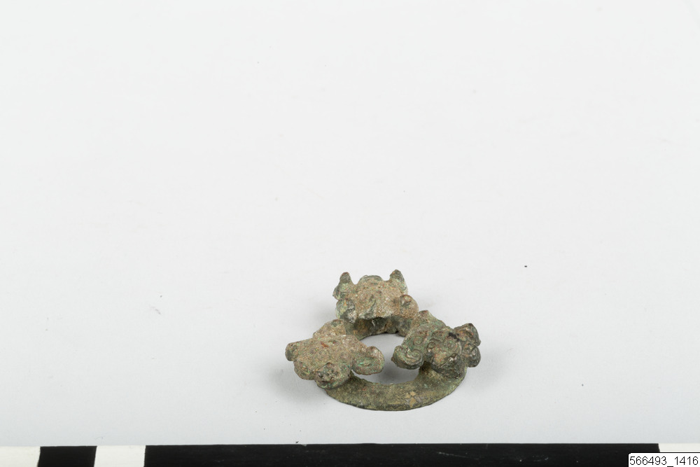 • Bronsföremål, beslag, i form av en tunn rund ring med tre fristående stiliserade djurmasker.
