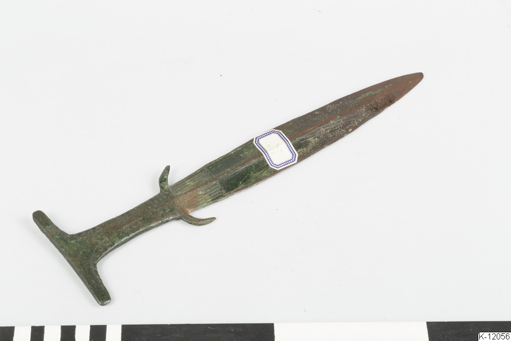 • Lancettformad dolk. Fästet är platt och brett och slutar i en lång tvärslå. Mörk brunsvart patina.
