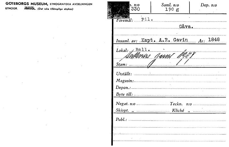 • GOTEBORGS MUSEUM, ETNOGRAFISKA AVDELNINGEN ETNOGR. MOL. (Det icke fillämpliga strykos) Saml. n:o 190 g Dep. n:o . n:o 330 oremål: Gåva,' Insaml. av: ,Kapt A.R. Gavin Ar: 1848 Lokal: y Bali 4,1~ "1". Stam: Utställt: Magasin: Depon.: Byte till: Negat. n:o Teckn. n:o Skiopt. „ KlicU „ Publ.. / [ocr]