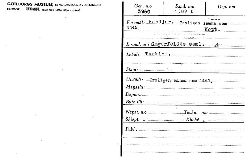 • Dep. n:o GOTEBORGS MUSEUM; ETNOGRAFISKA AVDELNINGEN ETNOGR. Igniägg. (Det icke tillämpliga strykes) Gen. n:o 3960 Saml. n:o 1589 b Föremål: Hand j ar . Troli.gen samma. som 4442. Köpt . Insaml. av: G.eg.erf.Q1.ate aml.- Ar: Lokal: Turkiet. Stam • Utställt: . Tro li ge n sann a s-em 4442 Magasin: Depon.: Byte till: Negat. n:o Teckn. n:o Skiopt. „ Kliché Publ.: [ocr]