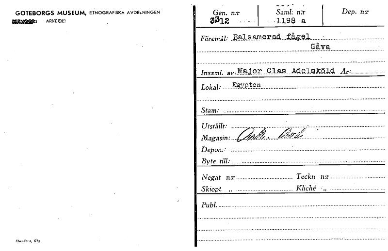 • GOTEBORGS MUSEUM, ETNOGRAFISKA AVDELNINGEN 4:it i,kg,ki"i■■ ARKg01.6.. Ehmders,Gbg Gen. n:r 012 --- • S atnt n:r - -1198a Dep. n:r Föremål: Balsamerad fågel • Gåva , Insaml. av•Major Clas Adelsköld Är• Lokal: Egypten Stam: Utställt: ,. Magasin: sAA - 4391 Depon.: Byte till: Negat n:r Teckn n:r Skiopt. „ Kliché -„ Publ. [ocr]