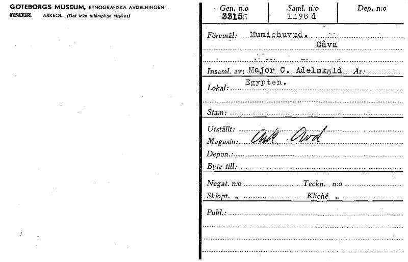 • GOTEBORGS MUSEUM, ETNOGRAFISKA AVDELNINGEN EMMITtl ARKEOL. (Det icke tillämpliga strykas) Gen. n:o 33155 Saml. 1198 d Dep. n:o Föremål: Mumie huvu_d Gåva insanil. av: Mai.or lidelsknla. Egypten. Lokal: Stam: Utställt: Magasin • Depon.: Byte till: Negat. n:o Teckn. n:o Skiopt. „ „ Publ • ) [ocr]