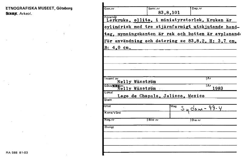 • ETNOGRAFISKA MUSEET, Göteborg &My. Arkeol. RA 588 81-03 Gen.nr Saml.nr 83,8,101 Dep.nr Föremål Lerkruka, ollita, i miniatyrstorlek, Krukan är cylindrisk med tre stjärnformigt utskjutande hand tag, mynningskanten är rak och botten är avplanan För användning och datering se 83,8,2, H: 3,7 cm, B: 4,0 cm, Insaml av lAr Nelly Wäsström ArG åvaagitKav Nelly y Wäsström 1983 Lokal Lago de Chapala, Jalisco ... Visa hela