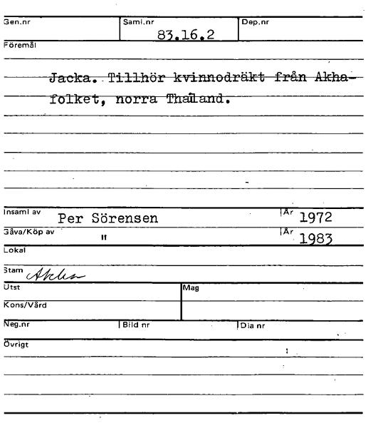 • 3en.nr Saml.nr Dep.nr 83.16.2 Föremål JeLcka. Tillhör kvinnodräkt från Akha- folket, norra Thaa and. Insaml av Per Sörensen i Är 1972 3åva/Köp av 11 Är 1983 Lokal Stam Utst Mag Kons/Vård Neg.nr 1 Bild nr IDia nr Övrigt [ocr]