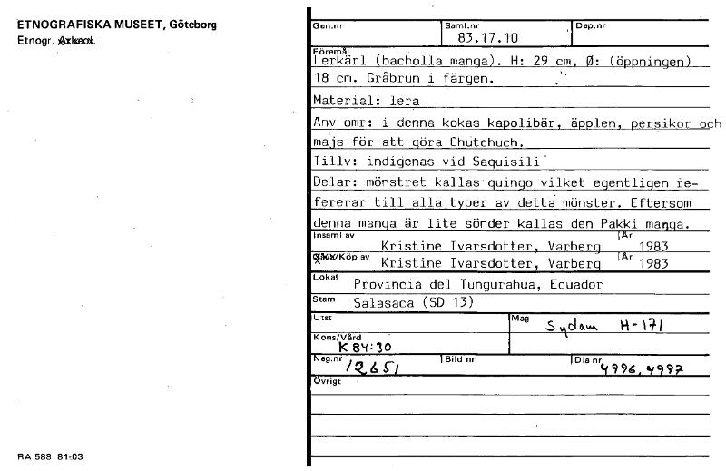 ETNOGRAFISKA MUSEET, Göteborg Et nogr. Axbeat RA 588 81,03 Gen.nr Sarni.nr 83.17.10 Dep.nr Föremål Lerkärl (bacholla manqa). H: 29 cm, 0: (öppningen) 18 cm. Gråbrun i färgen. Material: lera Anv omr: i denna kokas kapolibär, äpplen, persikor cx majs för att göra ChUtchuch. Tillv: indigenas vid Saquisili' Delar: mönstret kallas quingo vilket egentligen re- fererar till alla typer av detta mönster. Eftersom denna manqa är lite sönder kallas den Pakki mariga. Insaml av lAr Kristine Ivarsdotter, Varberg 1983 (*54X/Köp av Kristine Ivarsdotter Varberg lAr 1983 Lokal Provincia del Tungurahua, Ecuador Stam Salasaca (SD 13) Utst Mag 0, H- 11 Kons/Vård K 84 : 30 Neg.nr 1Bild nr Dia nr / Z.6 Ss/ e994, 9997 Övrigt [ocr]