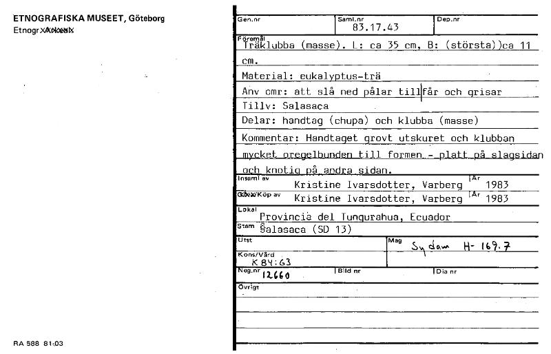 ETNOGRAFISKA MUSEET, Göteborg EtnogrxANCeedk( RA 588 81,03 Gen.nr Sarni.nr 83.17.43 Dep.nr Föremål Träklubba (masse). L: ca 35 cm, B: (största))ca 11 cm. Material: eukalyptus-trä Anv omr: att slå ned pålar tillfår och grisar Tillv: Salasaca Delar: handtag (chupa) och klubba (masse) Kommentar: Handtaget grovt utskuret och klubban <etoeelnly-------E---gUactfaås-Lacisidaci och knotig på andra sidan. ...