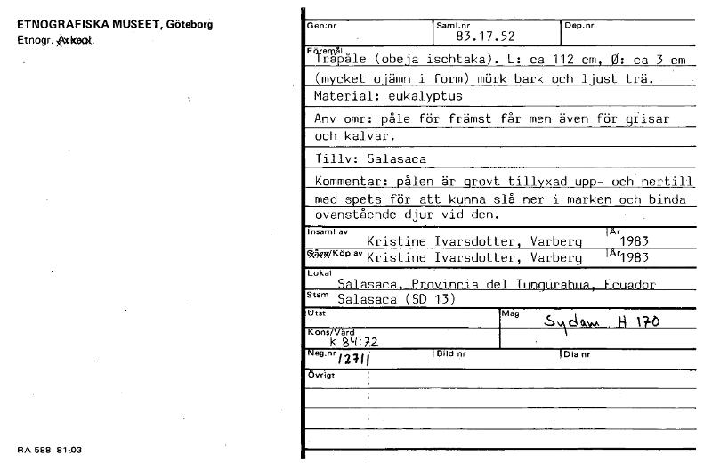 ETNOGRAFISKA MUSEET, Göteborg Etnogr. Åkkvot. RA 588 81,03 Genmr Saml.nr 83.17.52 Dep.nr F" enål (obeja ischtaka). L: ca 112 cm, 0: ca 3 cm (mycket ojämn i form) mörk bark och ljust trä. Material: eukalyptus Anv omr: påle för främst får men även för gfisar och kalvar. Tills: Salasaca Kommentar: pålen är grovt tillyxad upp- och nertill med spets för att kunna slå ner i marken och binda ovanstående djur vid den. Insaml av !År Kristine Ivarsdotter, Varberg 1983 l(‘41Wt(ör3 av Kristine Ivarsdotter, Varberg IÅr1983 Lokal Salasaca, Provincia del Tungurahua, Ecuador Stam Salasaca (SD 13) Utst Mag ,S■it å 0. N-174 Kons/Vård K84(:72 I N gmr12111 !Bild nr !Dia nr Övrigt [ocr]