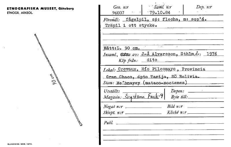 • ETNOGRAFISKA MUSEET, Göteborg ETNOGR. ARKEOL. ELANDERS.W113.1972. Gen. n: 96007 - -I • ' StiM1.• kr '79.10.84 ' Dep. n:r _. Föreniål: fågelpil, sp: flecha, ni: sop'å. Träpil i ett stycke. Mått:L. 90 cm. Insaml., M£104 av: j—Å.Alvarsson, Sthlmder: 1976 Köp från: dito Lokal: Crevaux, Rio Pilcomayo 7 Provincia Grar Charm, dptn Tari ja, St5 Bolivia. Stam: we'hnayey (mataco—noctAnPs) Utställt: I Depon:... Visa hela