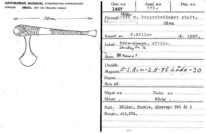 Gen. n:o Saml. n:o Dep. mo 1467 Föremål:( Yxani. kopparbeålaget skaft. ‘.; aålta P Insaml. av: .Möller År: 1887.. Lokal: . e—F;(34a g>c) p Afrika. Skt.".ee,5 PR IS Stam: X4.t.iwtu ? Utställt: Magasin:C—j, Depon.: Byte till: Negat. n:o Teckn. Skiopt. „ Kliché„ Pagels, Gleerup: Två år i Konfjo,"sid..3.74. GOTEBORGS MUSEUM, ETNOGRAFISKA AVDELNINGEN ETNOGR. >MOL (Det icke tillämpliga strykas)...