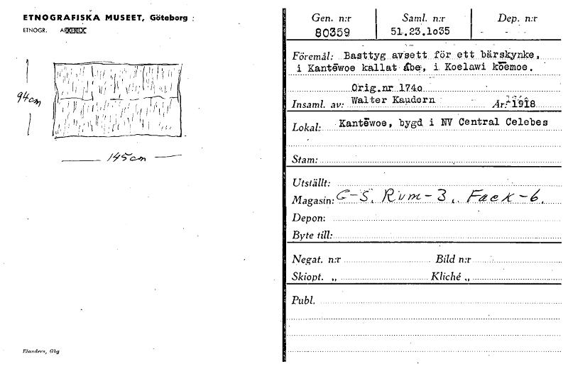 Gen. n:r Saml. n:r 80359 51-,23,1035 Dep. n:r I - ETNOGRAFISKA MUSEET, Göteborg : ETNOGR. Al Föremål: ...Baet.tyg avsett för ett bärskynke, i KantSwoe kallat åbe, i. Koelawi kriemoe. Orig.nr 174o Insaml. av: Walter Kagdern Är.49' Lokal. Kante-woe, bygd. i NV Central Celebes Stam: (*.ställt: Magasin: P-t - 3 c. Fa &.( —‘, Depon: Byte till: Negat. n:r Bild n:r Skiopt. „ Publ. Elander9, GI9 [ocr]