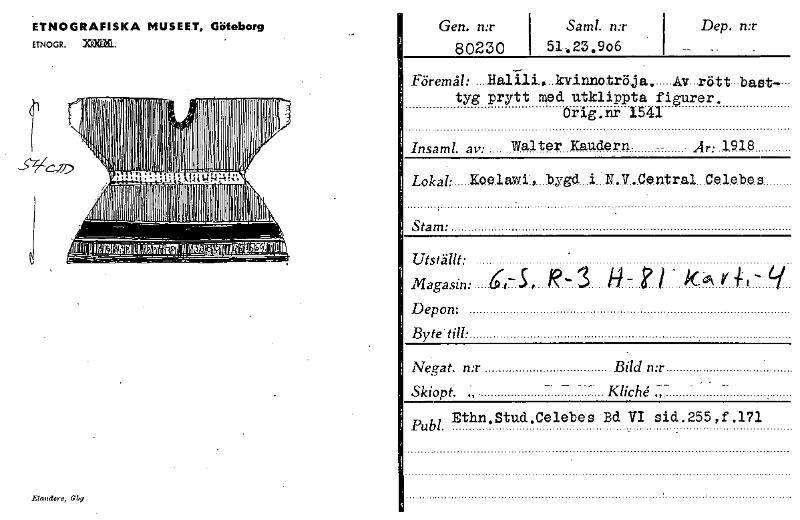 ETNOGRAFISKA MUSEET, Göteborg ETNOGR. XXE.X. Eko Eders, Gen. n:r Samt. n:r Dep. n:r 80230 51,23,,906 tiLj 1: 111111111 N , If tittlzmeuunrouliw-Agovesinnok 3 Föremål: _Baliii.,...kvinnoträja. Av—rätt—bast-- tyg prytt med utklippta figurer. örig.nr 1541 Lokal: Koelawi, bygd i N.V.Central Celebes Stam: Utställt: Magasin: .. 3 - Depon: Byte. till: Negat. n:r Bild n:r Skiopt. Kliché- Ethn.Stud.Celebes Bd VI sid.255,f.171 FUR -- Är: .1918 Walter Kaudern. Insaml. av: G&, [ocr]