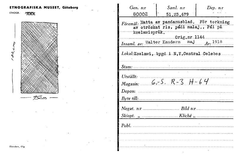 ETNOGRAFISKA MUSEET, Göteborg ETNOGR. A2ffc Saml. n:r 80002 51.23.679 De. p. n:r Gen. n:r Föremål: Matta av pandantisblad. För torkning av otröskat ris, pidi malaj., Peti på koelawispråk. Orig..= .1144 insarai. av: Walter Kaudern maj Ar: 1918 LokakKoelawi, bygd i N.V.Central Celebes Stam: Utställt: Magasin: r S R -3 Depon: Byte till: Negat. n:r Bild n:r Skiopt. „ Kliche „ Publ. Elrentiers, G79 [ocr]