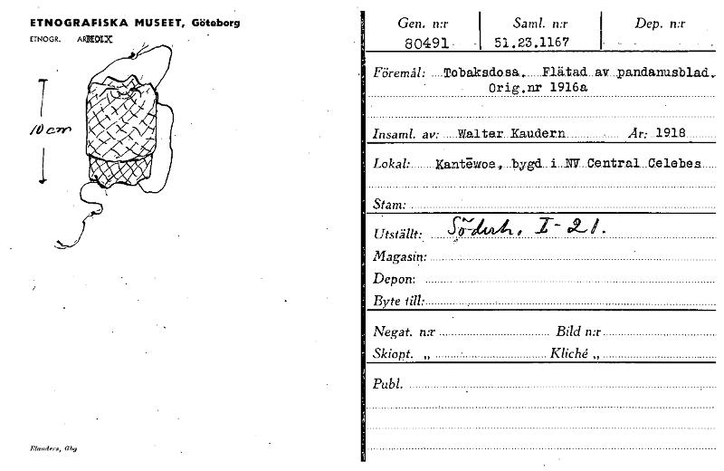 ETNOGRAFISKA MUSEET, Göteborg ETNOGR. ARICXX Gen. n:r Saml. n:r 80491 - 51,23.1167 Föremål: ....T.obaks.do.sa... Flätad..av...pandanusblad,. • Orig,nr 1916a Insaml. av: Walter .Kaudern. - Är: 1.918 L...