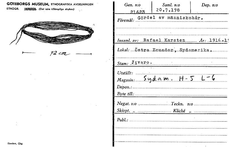 • GOTEBORGS MUSEUM, ETNOGRAFISKA AVDELNINGEN ETNOGR. MOM,. (Det icke tillämpliga strykas) 72 enz_- Gen. n:b Saml. n:o Dep. n:o 20.7.198 21 A2:3 Gördel av människohår. Föremål: Insaml. av: Raf.a.e.1 Är... Visa hela