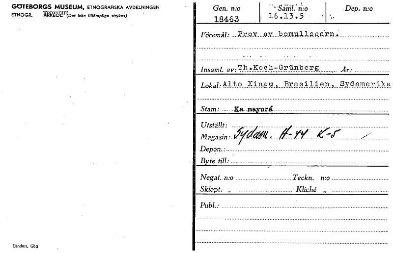 GOTEBORGS MUSEUM, ETNOGRAFISKA AVDELNINGEN ETNOGR. 125~)et icke tillämpliga strykes) Elanders, Gbg Gen. n:o 18463 -Siiril.. ri:o 16.13.5 . Dep. n:o .,, Föremål: . .PrOV av bomullsgarn.. _ .. _ _ Th.Koch-Grilnber Insaml. av: ilr: Lokal: Alto Xingu, Brasilien, Sydamerika Stam: la »Juri Utstänt: ,,, _i, Magasin:..jr«..07 , I r ,--. Depon.: Byte till: Negat. n:o Teckn. n:o Skiopt. „ KlicU „ Publ.• [ocr]