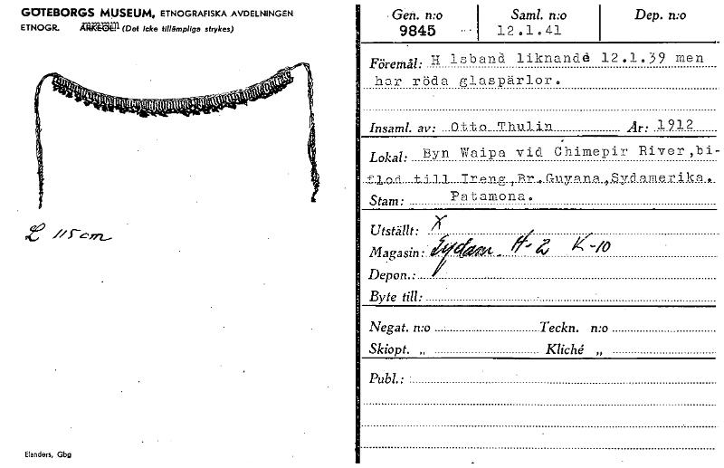 GOTEBORGS MUSEUM, ETNOGRAFISKA AVDELNINGEN E TNOGR. Arakgäll (Det icke tillämpliga strykes) Elanders, Gbg • Gen. n:o 9845 - • Sam!. n:o 12.141 Dep. n:o Föremål: H isband liknandd 12.1.59 men har röda glaspärlor. Insaml. av: Otto Thul ir Är: 1212 Lokal: Byn flod t i 11 Stam: Waipa vid Chimebir River ,b i- I-2.-1-1P: .. ,:R.r....Guy.P lip ,.S yslaril r i lc a , Patamona. Utställt: Magasin:.. . Depon.: Byte till: , . ... k -io Negat. n:o Skiopt. „ Teckn. n:o Kliché. „ Publ.: • • [ocr]