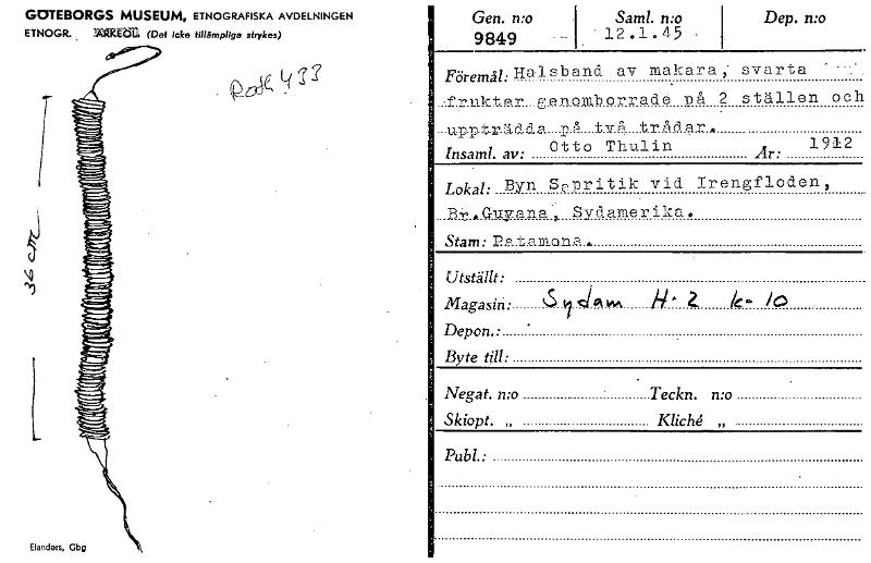 • GÖTEBORGS MUSEUM, ETNOGRAFISKA AVDELNINGEN ETNOGR. ~Sa (Det Icke tillämpliga strykas) Elandars, Gbg Gen. n:o . 9849 - Saml. n:o • 12.1.45 . Dep. n:o Föremål: Halsband av makara , svarta - - ....f.r.uk... Visa hela