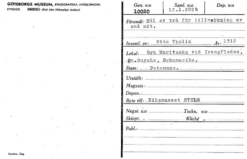 • GOTEBORGS MUSEUM, ETNOGRAFISKA AVDELNINGEN ETNOGR. ~tal (Det icke tillämpliga strykas) Elanders, Gbg Gen. n:o 10020 Saml. n:o . 1 12.1.-2021) Dep. n:o Föremål: Nål av trä för tillveitkning av små nät.... Visa hela