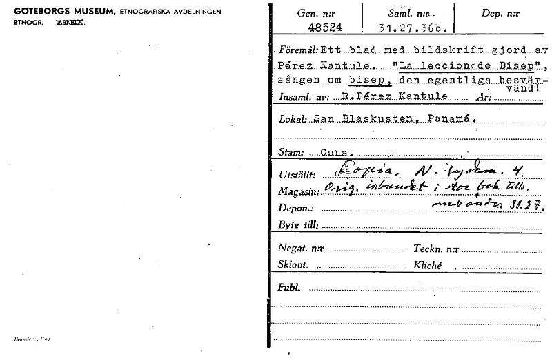 GOTEBORGS MUSEUM, ETNOGRAFISKA AVDELNINGEN ETNOGR. 3EJMEM. Elrender,, Ck,/ . Gen. n:r 48524 Sam- 1. n:r.. 31.27.36b. Dep. n:r Föremål: Et t. -blad... Pe.r.e.z...Ka.ntul.e. ne d ... bild.s.kr. if. t......
