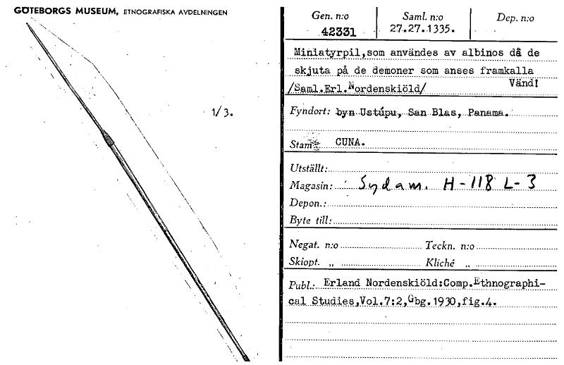 GOTEBORGS MUSEUM, ETNOGRAFISKA AVDELNINGEN Gen. n:o - .42331 • Saml. n:o 27.27.1335. Dep. n:o Minlatyrpiloom användes av aibitos då de skjuta på de deinoner som anses framkalla /Saml.Erl,hordenskiöld/ Vänd! Fyndort: byn.-Ustlipu.,--.San..Blaa y - - Panama ,. • sta rii- C UNA • Utställt: Magasin: ' 05. W ht . kl — Depon.: Byte till: Aregt. n:o Tcckn. n:o Skiopt. , laklie. " AH. Erland Nordenskiöld:Comp.Ethnographi- cal Studies,,Vol.7:2,Gbg.19301fig.4. [ocr]