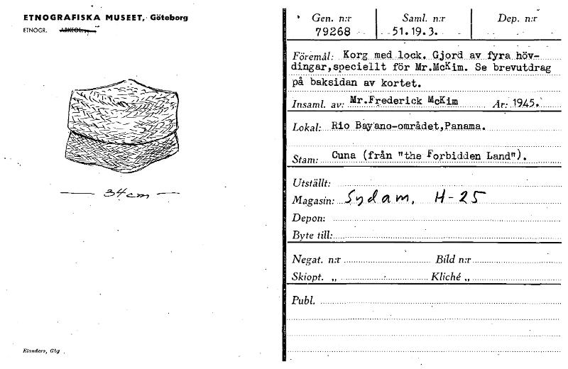 • , ETNOGRAFISKA MUSEET, • Göteborg ETNOGR. Gen. n:r Saml. n:r I Dep. n:r 79268 - . -51.19.3.. _ 1 Föremål: Korg med lock. Gjord av fyra höv- dingar,speciellt för Mr.McKim. Se brevutdrag på baksida...