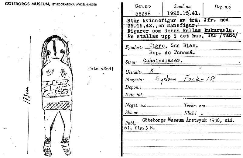 foto vänd! J Magasin: Depon. • Byte till: ss eic~ Ct. - e GOTEBORGS 'MUSEUM, ETNOGRAFISKA AVDELNINGEN Gen. n:o Samt. n:o --56398 - 1935.15:41. Dep. mo. Stor kvinnofigur av trä. 35415.42.,enmansfigur, ...