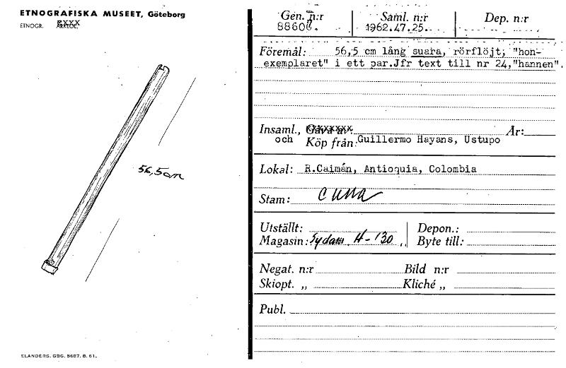 ELANDERS. GSG. 5687. 8. 61. Utställt: _____ Magasin :irdaio Depon.: Byte till: Gen. :r 8860g Sainl. n:i- 1962.47,25.- Dep. n:r • _ Föremål: 56, 5 cm lång stiara, ' rörflöjt; ' "hon:- exemolaret" i ett par.Jfr text till nr 24,"hannen". Insaml., Offlaiir09 och Köp från:Guillermo Hayans, Ustupo Lokal: h.Caimglni Antioquia, Colombia Stam: Negat. n:r Bild n:r Skiopt. „ Kliche „ Publ. ETNOGRAiISKA MUSEET, Göteborg ETNOG R. AW [ocr]