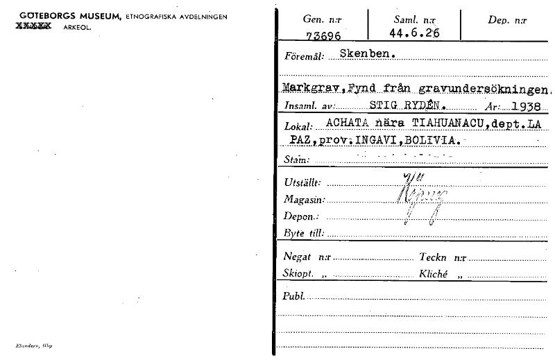 GOTEBORGS MUSEUM, ETNOGRAFISKA AVDELNINGEN XXIISLIE ARKEOL. .1.2mider,w,Gby Gen. n:r 73696 Sam!. n:r 44.6.26 Dep. n:r Föremål: Skenben. Markgrav,Fynd från gravunder8ö1ninge4 insam/. av: STIG .RYI4N... År: 1.93.8.... Lokal: ACHATA nära TIAHUANACU,dept.LA PAZ,prov.INGAVI,BOLIVIA.- Ska-m: Utställt: Vd/ Magasin: 3 ' . Depon.: / ci e= Byte till: Negat n:r Teckn n:r Skiopt. „ Kliché „ PubL [ocr]