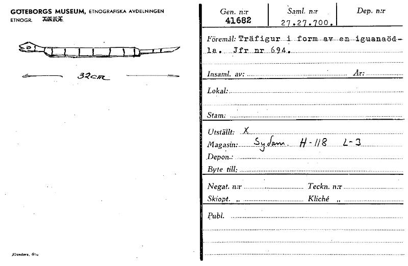 • GOTEBORGS MUSEUM, ETNOGRAFISKA AVDELNINGEN ETNOGR. Weara. Gen. n:r 41682 27.27.700.1 aml. n:r Dep. n:r FöremåhTräfigur i form av en iguanaöd- la. Jfr nr 694. Insaml. av: År: Lokal: Stam: Utställt: X... Visa hela