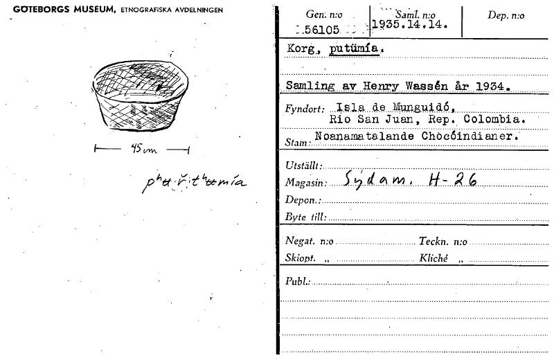 GOTEBORGS MUSEUM, ETNOGRAFISKA AVDELNINGEN Gen: n:o . «Samt :t 1955 . 14 Korg, putiimia. Dep. n:o vnA. Samling av Henry Wass6n år 1954. Fynciort:_isla de Munguid6, Rio San Juan, Rep. Colombia. Stam. N...