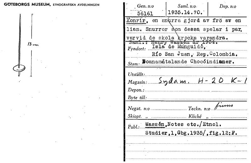 GOTEBORGS MUSEUM, ETNOGRAFISKA AVDELNINGEN 13 - 56161 1935.14.70.' Sam!. Dep. n:o Gen. n:o ronrir, en sn rra gjord av frö av en lian. Snurror om dessa spelar i par, varvid de skola roöka varandra. J. Fyndort: Isla de Munguidö, Rio San Juan,- Rep.colombia. StamBoanamåtalande Choo6indianer. • Utställt.. Magasin: St iC i Depon.: Byte till: Negat. mo Teckn. n:o Skiopt. „ Kliché „ Publ. Wass6n,Notes etc./Etnol. Studier,l,Gbg.1935/,fig.12:2. [ocr]