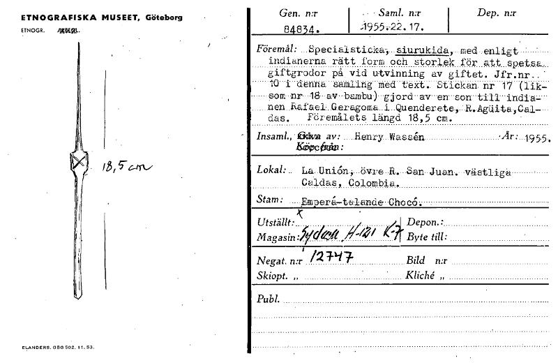 ELANDERS. GBG 502. 11. 53. Gen. n:r 84834. I .- • Sam!. n:r I ;19554-22.17. I Dep. n:r - Föremål: _Specialeticka}_eiurukida,--med-renligt - -- indianerna rätt form och storlek för att spets.a- giftgrodor på vid utvinning av giftet. Jfr.nr..- 10 i denna samling med text. Stickan. nr 17 (lik- som-nr-18-av-bambu)-gjord-av-en-son-tilI-india nen Rafaelh.Geragoma_i_QuendereteR.AgäitalCal--- das. Föremålets längd 18,5 cm. Insarnl.,•fthvm av: Henry Mask:Ån Ar:-1955, KöoIcHal: Lokal:.. La_Uni6n,.-övre-R--8an-Juan. västliga Caidas, Colombia. Stam: Ymperå-taIande-Choc6. . Utställt:X ydek j Depon.: • f 4/ 0 Byte till: Magasin: Negat. n:r i'4 -7-7 r Bild n:r Skiopt. „ Kliché „ Pub!. ETNOGRAFISKA MUSEET, Göteborg ETNOGR. MULL. Fc-nr [ocr]Stäng