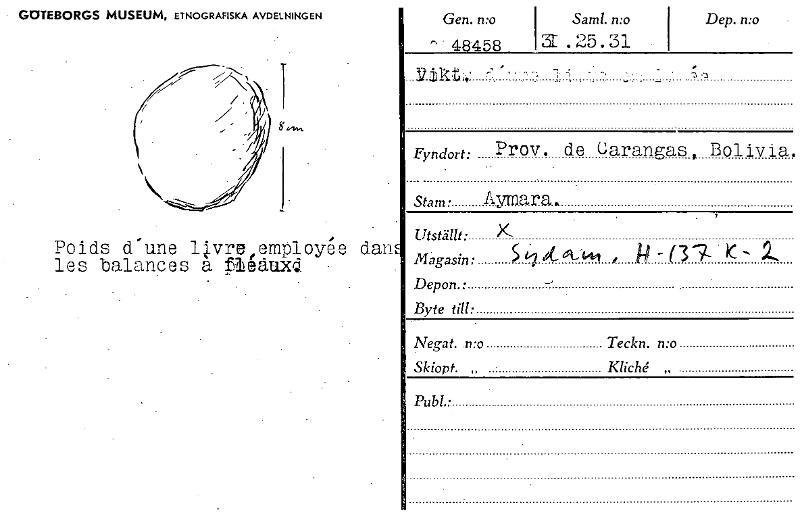 • GCPTEBORGS MUSEUM, ETNOGRAFISKA AVDELNINGEN Gen. n:o ^ 48458 Sam!. n:o . 25.31 Dep. n:o Fy:~ Prov. de Carangas, Bolivia. Stam . Aymara. Poids d'une 14vrefemployee dan les balances a fleåuxd Utställ... Visa hela