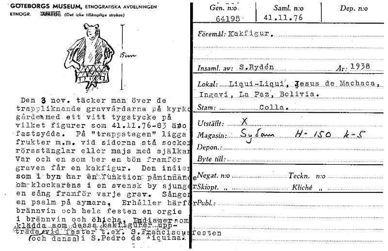 • GOTEBORGS MUSEUM, ETNOGRAFISKA AVDELNINGEN ETNOGR. UllikätTel (Det icke tillämpliga strykes) 64195- E ,Gen. n:o. Sam!. n:o 41.11.76 Dep. mo Den 3 nov. täcker man över de trapuliknande gravvårdarna på kyrk gårde'nmed-ett•vitt tygstycke på vilket figurer som 41.11.76-83 äto •fastsydda. På "trappstegen" ligga frukter m.m. vid sidorna Stå socke rörsstänglar eller majs med sjäika Var och en som ber en .bön framför graven får en kåkfigur. Den india som 1:byruhar trUfiliiktionpåMinfiän bflicklockaråns i en svensk by sjung en sång framför varje grav,. Sånge e.n psalm på aymara, Erhåller härf brännvin och hela festen en orgie i brännvin och dIrd,cha, raddanersom tiidift st-er" s c u och dansali S.Pedro de Tiquinal Föremål: Kak,f i ur Insaml. av: $.,Ryden 1938 Lokal: Li.qui.-Liquil, Tesus de Iviachaca, Ingavi, La Paz', Bolivia. Stam: Calla. Utställt: Magasin: Depon.: Byte till: x - eA/4at. mo Teckn. n:o rSkiopt. „ Kliché „ rPubl.: osten [ocr]