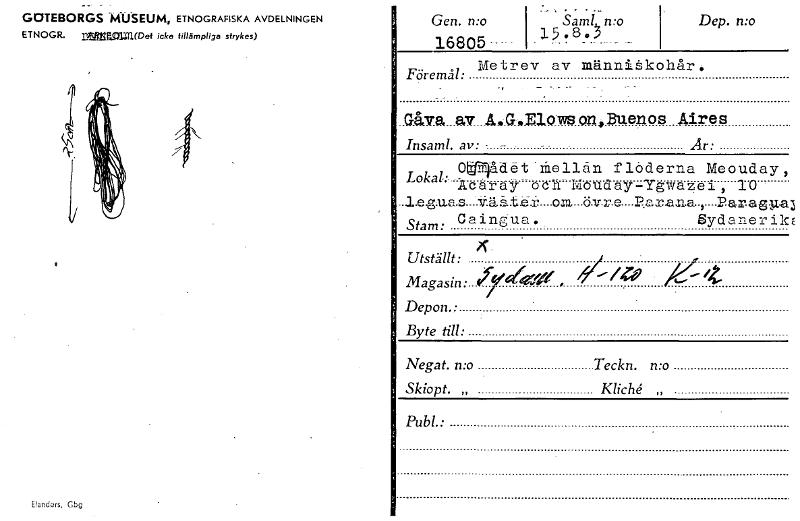 3 _ GOTEBORGS 'MUSEUM, ETNOGRAFISKA AVDELNINGEN ETNOGR. 115~1,111(Det icke tillämpliga strykes) Elanders, Gbg Gen. n:o 16805--- Sam! n:o 15.83 - - Dep. mo Metrev av männiåkohår. Föremål: _.GAva...av...ILGalowsion Buenos Aires Insaml. av: - -- - Är: 0 rådet"±ellan flederna Meouday, Lokal:.-licaray oen Mbuday-Ygwazel, 10 _LeguaaV.äåtä.r on 6v27.a-13,11x.ana,-Paragga Stam: 0aingua.. Sydanerik Utställt: Magasin: 3761470 Depon.. Byte till: Negat. n:o Teckn. n:o Skiopt. „ Kliché „ Publ.: [ocr]