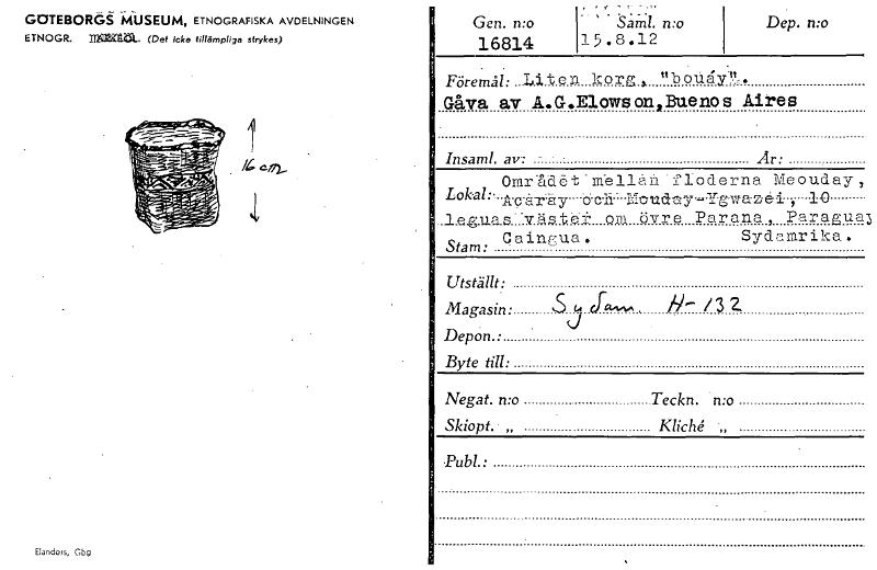 GOTEBORdä MUSEUM, ETNOGRAFISKA AVDELNINGEN ETNOGR. Mata. (Det icke tillämpliga strykes) Elanders, Gbg • Gen. n:o Saml. mo16814 115.8.12 Dep. mo " • Föremål: Liten korg olig.y. Gåva av A.G.Elowson,Baen...