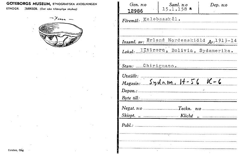 GOTEBORGS MUSEUM, ETNOGRAFISKA AVDELNINGEN ETNOGR. l'ARKEOE. (Det icke tillämpliga sfrykes) Elanders, Gen. n:o 12986 Saml. n:o 15.1.158 a Dep. n:o Föremål: Kalebasskål. Erland Nordenskiöld Ar:1913-14...