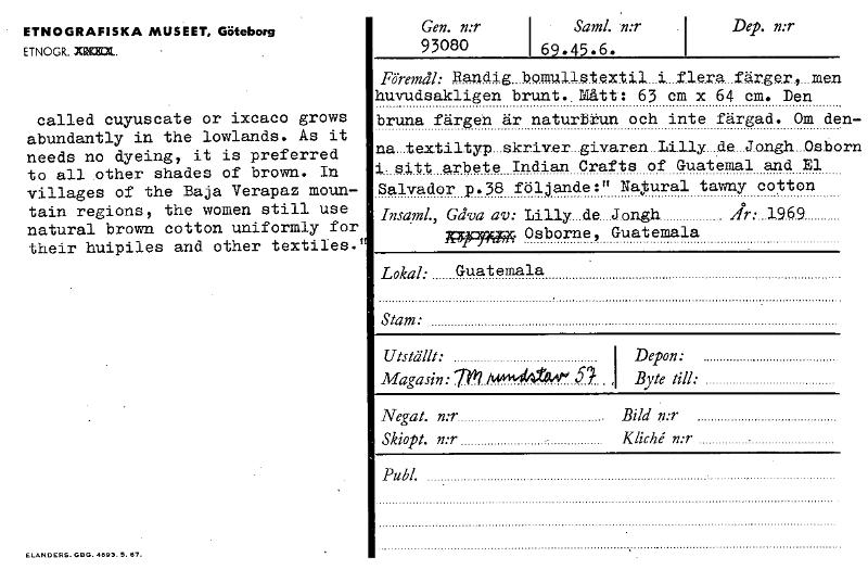 ETNOGRAFISKA MUSEET, Göteborg ETNOGR. =x. Gen. 71.T 93080 I• Sami ;13' I 69.45.6. Dep. n:r called cuyuscate or ixcaco grows abundantly in the lowlands. As it needs no dyeing, it is preferred to all other shades of brown. In villages of the Baja Verapaz moun- tain regions, the women still use natural brown cotton uniformly for their huipiles and other textiies. Föremål: Randig bomulls-textil tf.lera_färger5_men huvudsakligen brunt.. Mått: 63 cm x 64 cm. Den bruna färgen är naturliun och inte färgad. Om den- na_textiltyp_skriver_givaran_Iilly de ATongh_Osborn i. sitt arbete Indian Crafts of Guatemal and El Salvador p.38 följande:" N4ura1 tawny cotton Insaml., Gåva av: Lilly de Jongh .19.6.9 ppyytTA Osborne, Guatemala Lokal: Guatemala Stam: Utställt: I Depon: Magasin: 77 /~441-0,0# Byte till: • Negat. n:r Bild n:r Skiopt. n:r Kliché n:r Publ. ELANORS. GBG. 4693.5. 67. [ocr]Stäng