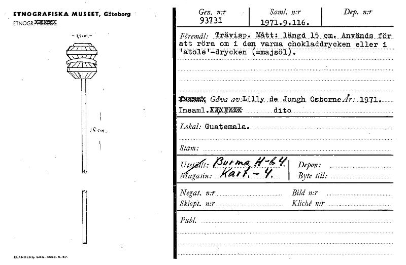 • ETNOGRAFISKA MUSEET, Göteborg ETNOGR.4KW. 11.1. I Saml. 1LT I Dep. wr 93731 i 1971.9.116. I .Föremål: Trävisp. Mått: längd 15 QM. Används för_ att röra om i den varma chokladdrycken eller i tatole'-dr... Visa hela