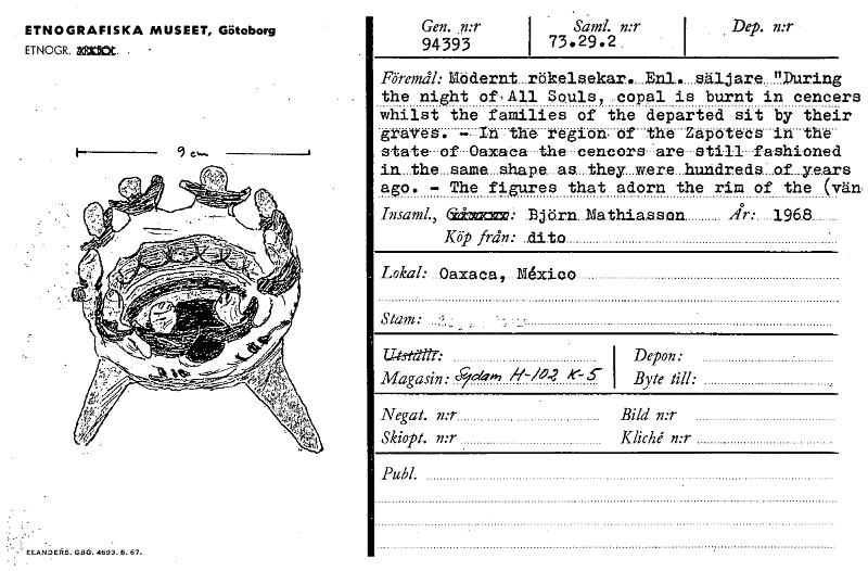 ETNOGRAFISKA MUSEET, Göteborg ETNOGR. 220/2t. . ELANDEfiLGEIG,4693.5.67. Gen. .n:r 94393 Saml. n:r . i 73.29.2. I . Dep. n:r Föremål: Mödernt...rökels.ekar.....Enl......säljare. "Durinå the night of-All Souls, .copal is burnt in cencE whilst the families of the departed sit by thel graireS. —In ,the region. of the Zapotecs in the .state-of-Oaxeca-the-cencors-lare...stili-fashioned in....the...same...s.ha.p.e...a.s....th.ey were...hundreds....o.f..ye.az ago. - The figures that adorn the rim of the (T InsamL, ed6710032 .' . B3örn..11a.thia.sson År: 196.8 Köp från: ..dito Lokal: ..0axaca.,...1163ciao Stam: ,. • Uktiiitr: Magasin: c9c4"», // /'- ic-- 5. Depon: Byte till: Negat. n:r Bild n:r Skiopt. n:r Klich6. n:r PubL . • rs än, [ocr]